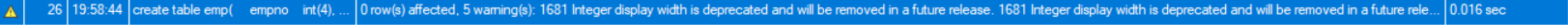 Warning | 1681 | Integer display width is deprecated and will be removed in a future release. 예제를 따라서 SQL문을 작성하다가 마주친 워닝 문구 아마 범위 지정때문에 경고를 받은듯하다 어떤 경고인지 자세하게 보