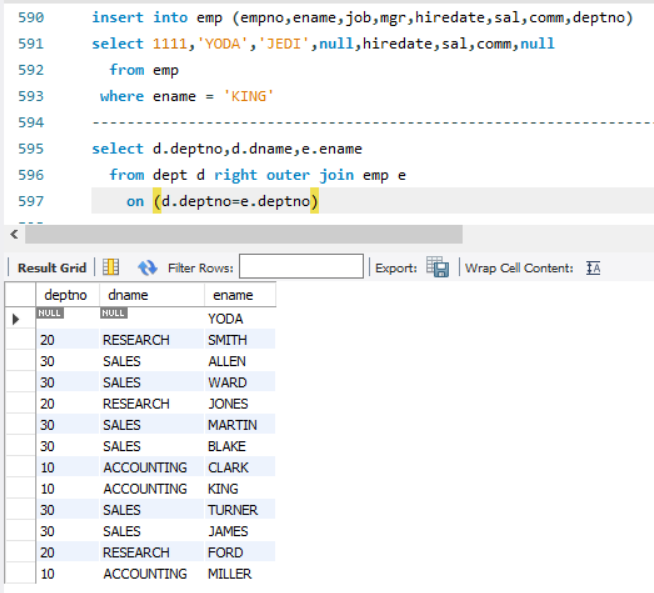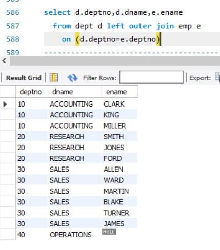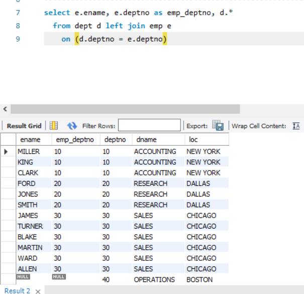 OPERATIONS 부서는 해당 부서에 사원이 없는데도 반환됩니다. EMP 테이블이 DEPT 테이블에 외부 조인되었기 때문입니다.