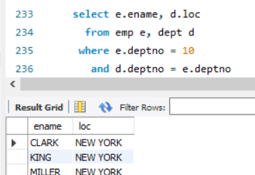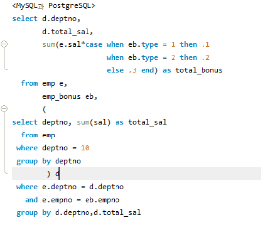 부서 10의 모든 급여 합계가 먼저 계산되고 그 행을 EMP 테이블에 조인한 다음 EMP_BONUS 테이블에 조인합니다.