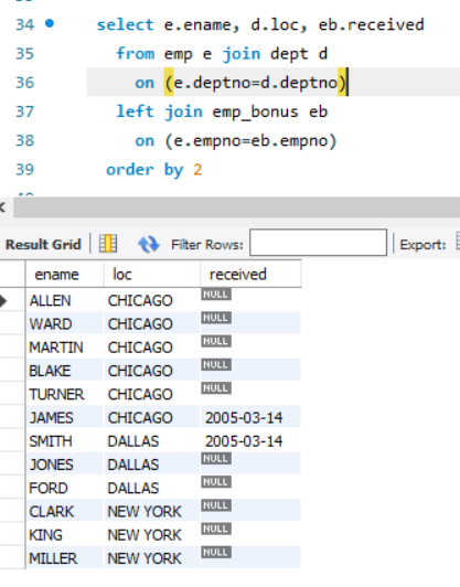 외부 조인을 사용하여 원래 쿼리의 데이터의 손실 없이 추가 정보를 얻을 수 있습니다. 먼저 EMP 테이블을 DEPT 테이블에 조인하여 모든 사원과 그들이 일하는 부서의 위치를 파악한 다음, EMP_BONUS 테이블에 외부 조인하여 보너스 날짜가 있으면 이를 반환합니다.