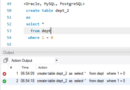 CTAS(Create Table As Select) 문을 사용하는 경우 WHERE 절에 거짓 조건을 지정하지 않으면 쿼리의 모든 행으로 생성 중인 새 테이블을 채웁니다. 제공된 해법에서 쿼리의 WHERE 절에 있는 1=0 표현식으로 인해 행이 반환되지 않습니다. 따라서 CTAS 문의 결과는 쿼리의 SELECT 절에 있는 열에 기반을 두는 빈 테이블입니다.