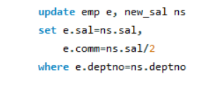 DEPTNO 열은 NEW_SAL 테이블의 기본 키 입니다. EMP.DEPTNO와 NEW_SAL.DEPTNO 같이 일치할 경우, NEW_SAL 테이블을 사용하여 EMP 테이블에서 특정 사원의 급여 및 커미션을 업데이트하고 EMP.SAL을 NEW_SAL.SAL로 업데이트한 뒤에 EMP.COMM을 NEW_SAL.SAL의 50%로 업데이트하려고 합니다. EMP의 행은 다음과 같습니다.