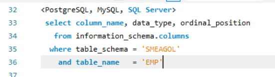 Oracle의 시스템 뷰와 DB2의 시스템 테이블은 벤더에 특화되어 있습니다. 반면에 PostgreSQL, MySQL 및 SQL Server는 ISO SQL 표준에 의해 정의된 뷰 집합인 정보 스키마(information schema)를 지원합니다. 따라서 세 데이터베이스 모두에 대해 같은 쿼리를 수행할 수 있습니다.