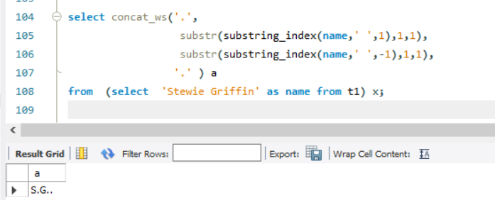 인라인 뷰 X는 이름에서 찾은 공백수만큼 SUBSTR 함수를 호출하여 이니셜을 추출할 수 있습니다. SUBSTRING_INDEX에 대한 한 번의 호출은 공백을 기준으로 문자열을 개별 이름으로 구문 분석합니다. 성과 이름만 있으므로 case 문의 ELSE 부분에 있는 코드가 실행됩니다.