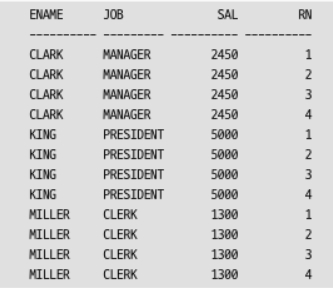 순위 함수 ROW_NUMBER OVER를 사용하여 고유한 JOB/ENAME 조합을 만듭니다. 윈도우 함수에서 반환된 값을 그룹화하는 동안 CASE 식과 집계 함수 MAX를 사용하여 결과셋을 피벗합니다.