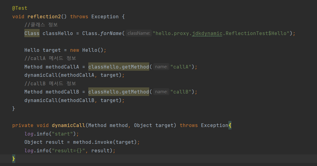 리플렉션은 클래스나 메서드의 메타정보를 사용해서 동적으로 호출하는 메서드를 변경할 수 있다.