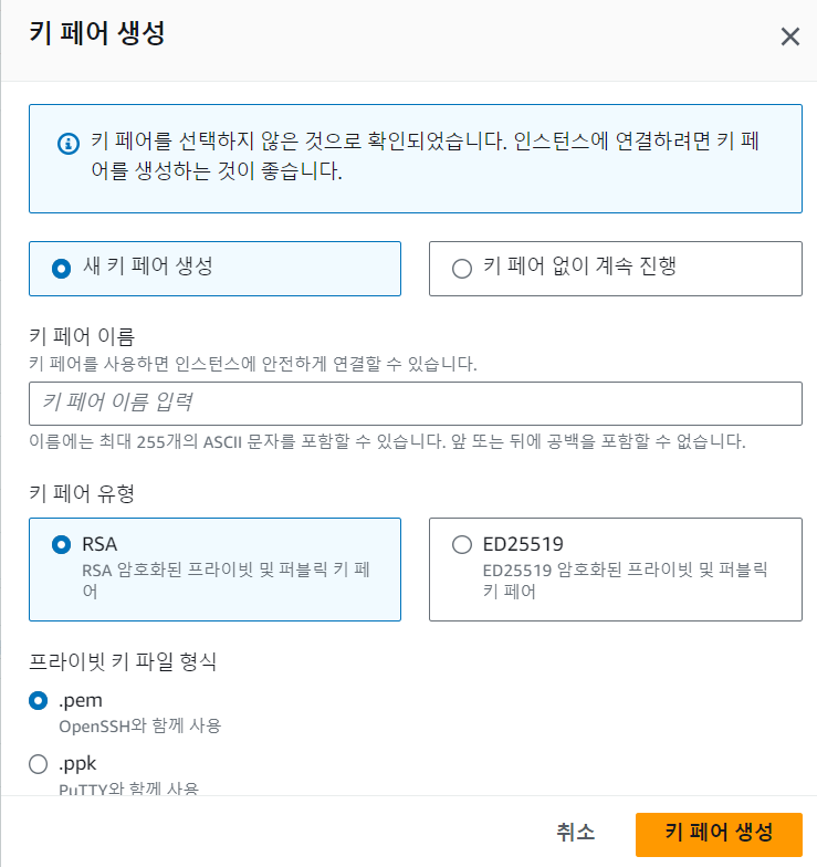 pem 키는 이후 EC2 서버로 접속할 때 필수 파일이니 잘 관리할 수 있는 디렉토리로 저장합니다.
