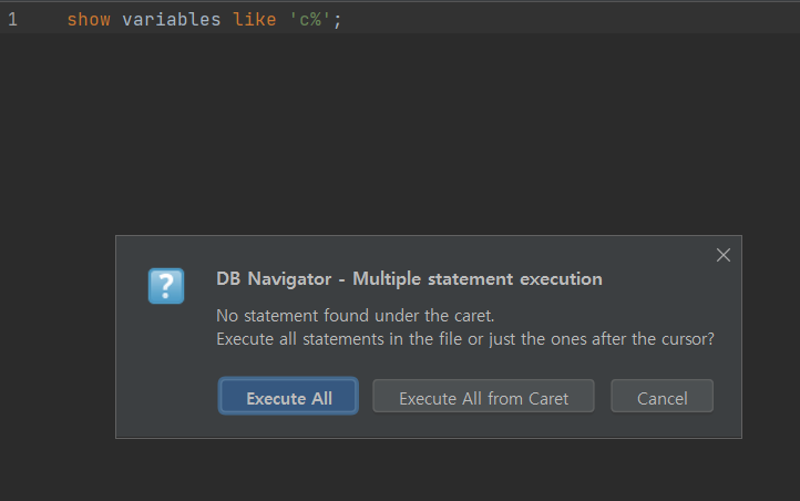 No statement found under the caret. Execute all statements in the file or just the ones after the cursor? 본문