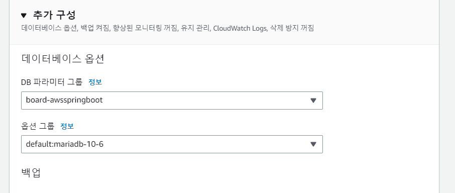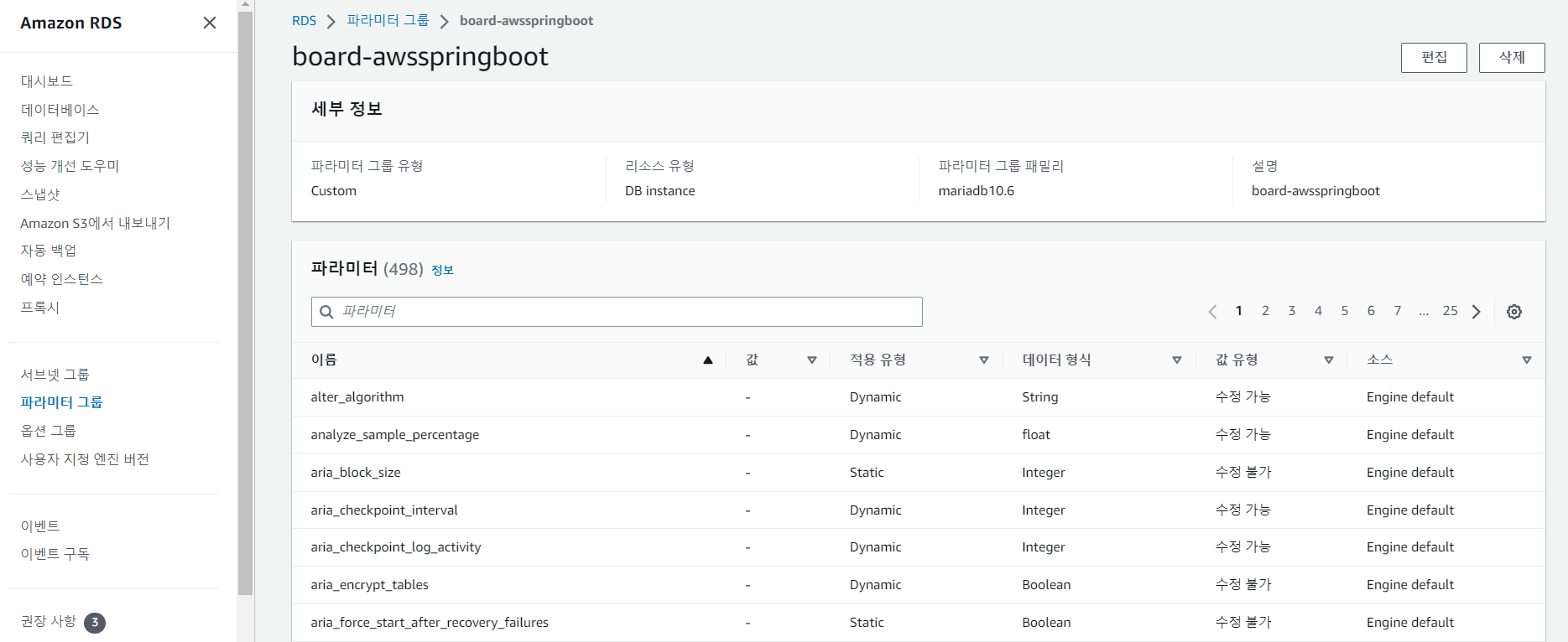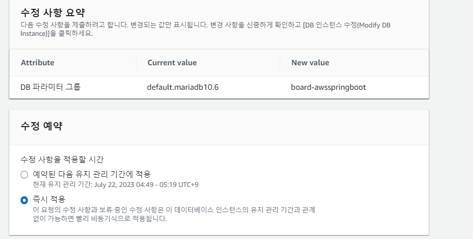 수정에서 파라미터 그룹을 생성한 것으로 변경해준다.