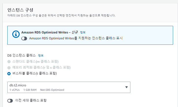 db.t2.micro 인스턴스는 주로 개발/테스트 환경, 초보자용 프로젝트, 가벼운 웹 애플리케이션 등에 적합합니다. 그러나 실제 운영 환경이나 중요한 프로덕션 데이터베이스에는 보다 높은 성능을 제공하는 인스턴스 유형을 선택하는 것이 바람직합니다. AWS RDS는 다양한 인스턴스 유형을 제공하므로, 요구 사항에 맞는 적절한 인스턴스 유형을 선택할 수 있습니다.