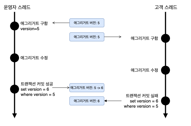 이 쿼리는 수정할 애그리거트와 매핑되는 테이블의 버전 값이 현재 애그리거트의 버전과 동일한 경우에만 데이터를 수정한다. 그리고 수정에 성공하면 버전 값을 1 증가시킨다. 따라서 다른 트랜잭션이 먼저 데이터를 수정해서 버전 값이 바뀌면 데이터 수정에 실패하게 된다.
