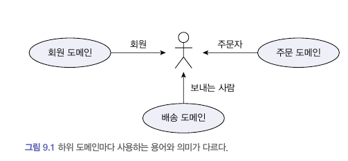 처음 도메인 모델을 만들 때 빠지기 쉬운 함정이 도메인을 완벽하게 표현하는 단일 모델을 만드는 시도를 하는 것이다. 그런데 1장에서 말한 것처럼 한 도메인은 다시 여러 하위 도메인으로 구분되기 때문에 한 개의 모델로 여러 하위 도메인을 모두 표현하려고 시도하면 오히려 모든 하위 도메인에 맞지 않는 모델을 만들게 된다.