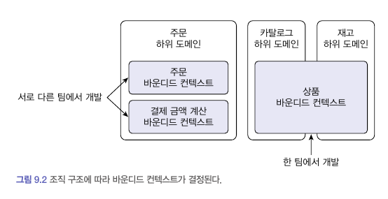 이상적으로 하위 도메인과 바운디드 컨텍스트가 일대일 관계를 가지면 좋겠지만 현실은 그렇지 않을 때가 많다. 바운디드 컨텍스트는 기업의 팀 조직 구조에 따라 결정되기도 한다.