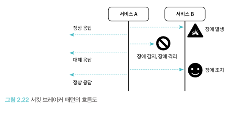시스템 과부하나 특정 서비스에 문제가 생겼을 때 자연스럽게 다른 정상적인 서비스로 요청 흐름이 변경되게 해야 한다. 전기회로 차단기와 비슷하다고 해서 서킷 브레이커 패턴.