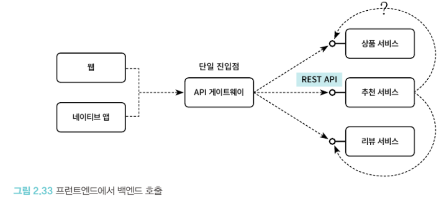 클라이언트에서 서버 측에 존재하는 마이크로서비스 REST API를 호출할 때 사용되는 기본 통신 방법, 다양한 클라이언트 채널 연계나 라우팅 및 로드 밸런싱을 원활하게 하기 위한 방법으로 중간에 API 게이트웨이를 둘 수 있다.