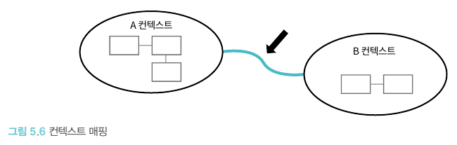하나의 큰 도메인을 여러 개의 바운디드 컨텍스트로 식별하면 비즈니스 수행을 위해 여러 개의 컨텍스트가 연계해야 하는 경우가 발생한다. 이러한 컨텍스트 간의 의존 관계를 DDD에서는 컨텍스트 매핑이라 하고, 연관관계에 있는 두 컨텍스트 사이에 선을 그려서 표시한다.