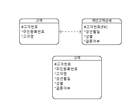 일대일 관계의 엔터티를 합칠 때는 주의해야 한다. 두 엔터티의 성격이 같은지를 검토해야 하고, 관계비가 불변인지를 검토해야 한다.