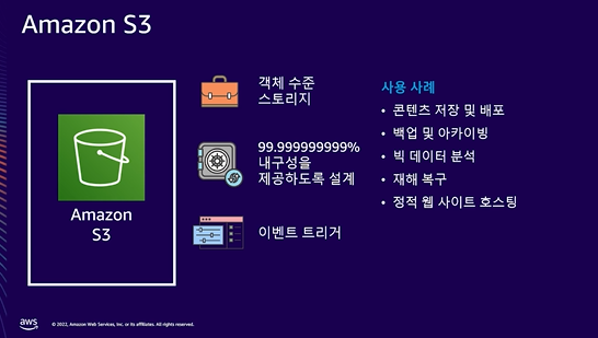 여러 디바이스에 중복 저장, 높은 가용성과 내구성을 지닌 스토리지로써 백업과 아카이브 용도로 유용하게 사용