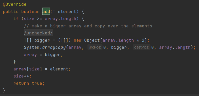 단일 인자 버전 메서드인 add(E)를 호출하고 add(E) 메서드는 새로운 인자를 마지막에 넣습니다.