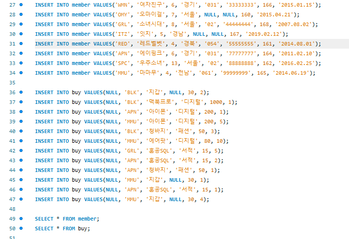 INSERT INTO member VALUES('BLK', '블랙핑크', 4, '경남', '055', '22222222', 163, '2016.08.08');