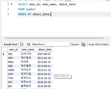 기본값은 ASC인데 Ascending의 약자로 오름차순을 의미하고, DESC는 Descending의 약자로 내림차순을 의미합니다.