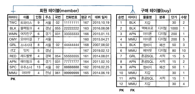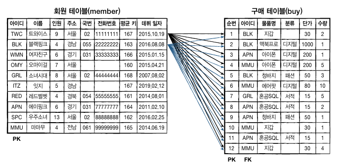 예를 들어, 회원 테이블에서 블랙핑크의 아이디는 'BLK'로 1명(1,one) 밖에 없습니다. 그래서 회원 테이블의 아이디를 기본 키(primary key, PK)로 지정했습니다. 구매 테이블의 아이디에서는 3개의 BLK를 찾을 수 있습니다. 즉, 회원은 1명이지만 이 회원은 구매를 여러 번 할 수 있는 것입니다. 그래서 구매 테이블의 아이디는 기본 키가 아닌 외래 키(Foreign Key, FK)로 설정했습니다.