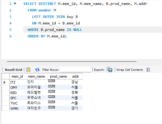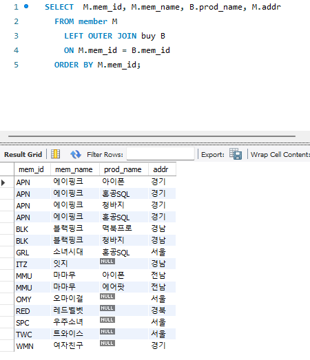<LEFT | RIGHT | FULL> OUTER JOIN <두 번째 테이블(RIGHT 테이블)>