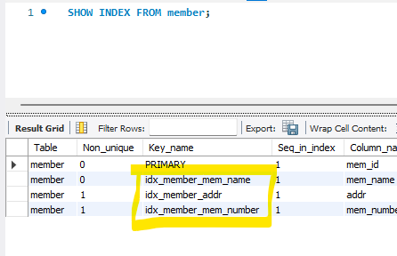 현재 회원 아이디(mem_id), 회원 이름(mem_name), 주소(addr) 열에 인덱스가 생성되어 있습니다.