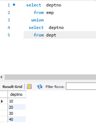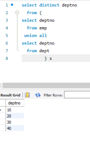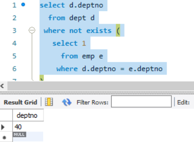 MySQL 해법을 사용할 때 고려할 사항은 중복 행 제거입니다. DEPTNO가 키 필드가 아니라면 다음과 같이 DISTINCT를 사용하여 EMP에서 누락된 각 DEPTNO 값이 한 번만 나오도록 할 수 있습니다.