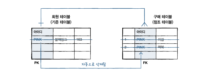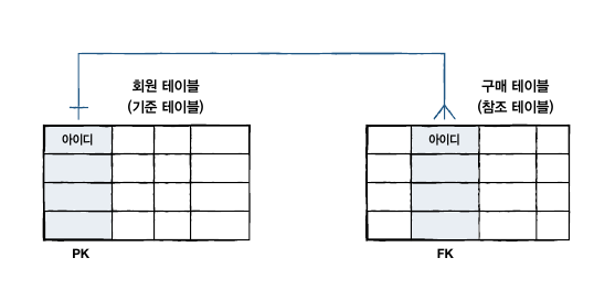 구매 테이블의 아이디(FK)는 반드시 회원 테이블의 아이디(PK)로 존재합니다.