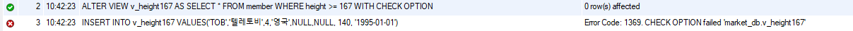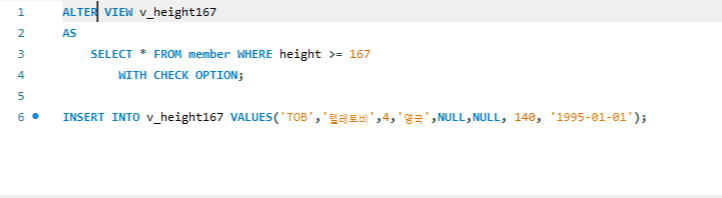 예약어 WITH CHECK OPTION을 통해 뷰에 설정된 값의 범위가 벗어나는 값은 입력되지 않도록 할 수 있습니다.