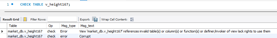 뷰가 조회되지 않으면 CHECK TABLE 문으로 뷰의 상태를 확인해볼 수 있습니다.