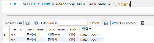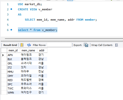 앞의 예에서 만든 v_member 뷰에는 사용자의 아이디, 이름, 주소만 있을 분 사용자의 중요한 개인 정보인 연락처, 평균 키, 데뷔 일자 등의 정보는 들어 있지 않습니다.