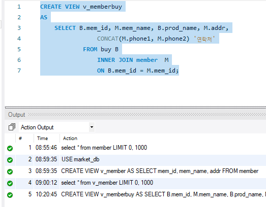 뷰를 만든 후에 뷰에 접근하는 방식은 테이블과 동일하게 SELECT 문을 사용합니다. 전체에 접근할 수도 있고, 필요하면 조건식도 테이블과 동일하게 사용할 수 있습니다.