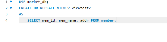 기본적인 뷰를 생성하면서 뷰에서 사용될 열 이름을 테이블과 다르게 지정할 수도 있습니다. 별칭 AS를 사용.